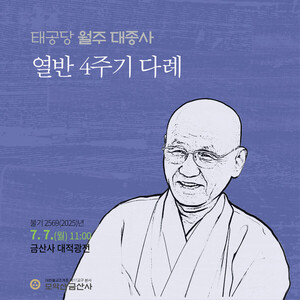 태공당 월주 대종사의 열반 4주기를 기리는 추모 다례가 7일 오전 11시, 김제 금산사 대적광전에서 봉행됐다.이번 추모 다례는 금산사 주관으로 열렸으며, 태공문도회와 종단 관계자, 재가불자들이 참석한 가운데 엄숙한 분위기 속에서 진행됐다. 추모식에서는 월주 스님의 생전 법문 낭독과 함께, 자비와 연대의 가르침을 되새기는 시간이 마련됐다.월주 대종사는 1954년 법주사에서 금오 스님을 은사로 출가했고, 1962년 금산사 주지로 부임한 이래 조계종 중앙종회의원, 교무부장, 총무부장, 중앙종회의장 등 주요 종무직을 역임했다. 1980년