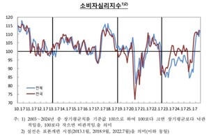전북지역 소비자들의 경제 심리가 7년 10개월 만에 가장 높은 수준인 것으로 나타났다.한미 관세 협상 타결과 3분기 국내총생산(GDP) 성장률 전망치 상회 등의 영향으로 소비자심리지수가 크게 상승한 것으로 분석된다.한국은행 전북본부가 25일 발표한 '11월 전북지역 소비자동향조사 결과'에 따르면 소비자심리지수(CCSI)는 112.3으로 전월(108.6)보다 3.7p 올랐다. 도내 CCSI는 지난 2월 87.8에서 꾸준히 상승세를 이어왔다. 7월에는 108.7까지 오르며 두 자릿수 회복을 기록했으나, 10월에는 108.6으로 소폭 하
