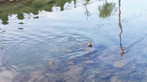 2025년 9월 21일 오후 6시 전주고속버스터미널 옆 노송천에서 수달이 물고기 사냥에 열중하고 있다. 비가 며칠 내려 물이 맑아지면서 사냥이 가능해진 것으로 보인다.