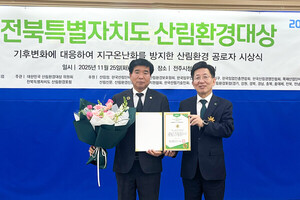 남원시의회 김영태 의장이 지난 25일 전주시청에서 열린 2025년 전북특별자치도 산림환경대상 시상식에서 수상의 영예를 안았다.(사)산림환경포럼이 주최하고 산림청 등이 후원하는 이 상은 산림 자원의 보호와 지속 가능한 관리에 기여한 인사에게 주어지는 권위 있는 상이다.김 의장은 평소 산림의 중요성을 강조하며 정책적 노력과 현장 중심 의정활동을 꾸준히 펼쳐왔다.특히 남원 지역 산불 예방과 진화 인력 지원에 남다른 관심을 기울여 건조기에는 산불 진화대를 직접 찾아 긴급 대응 상황을 점검하고 현장 근무자들의 노고를 치하하는 등 실질적 지원