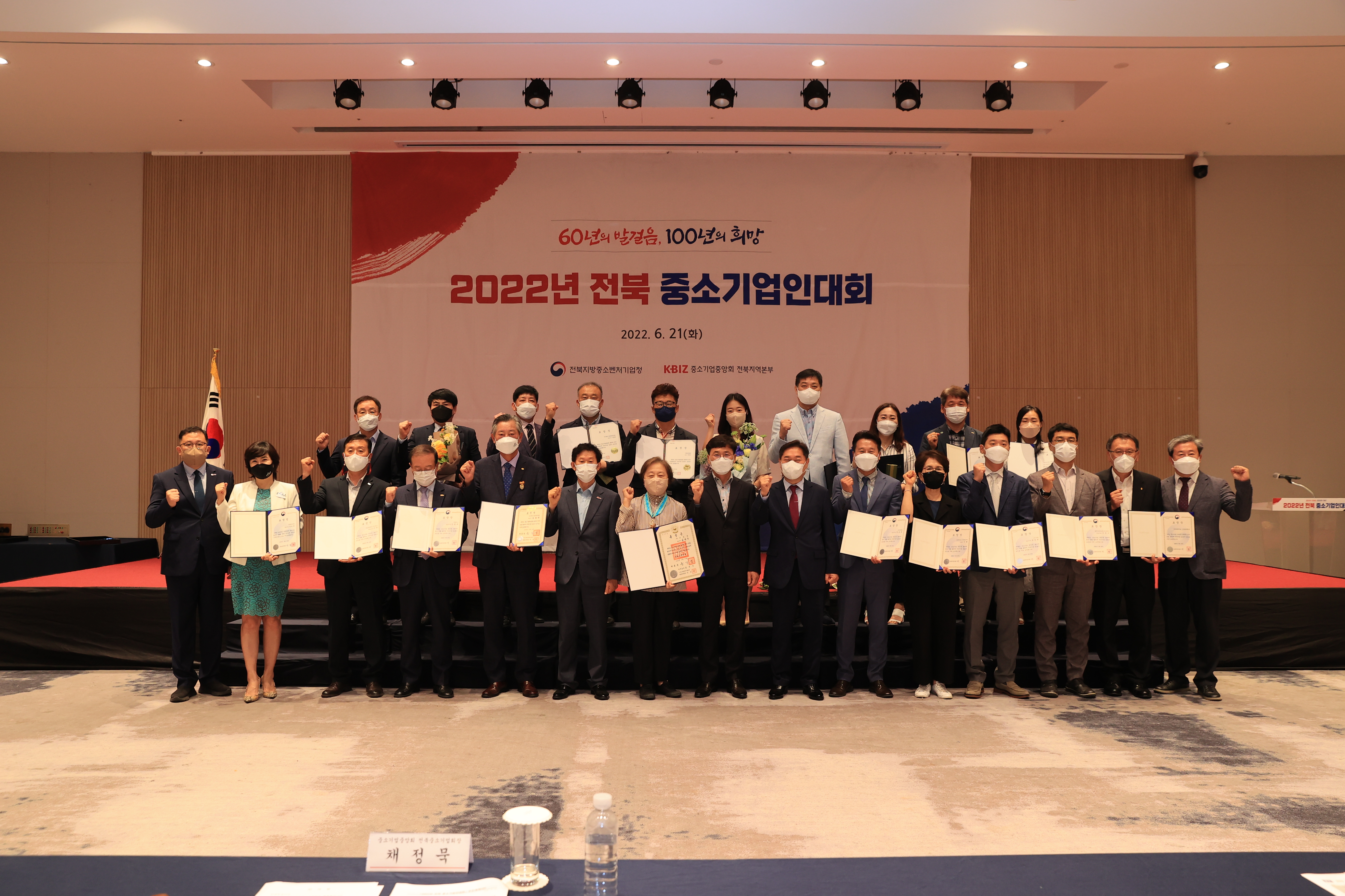 전북중기청(청장 신재경)과 전북지방조달청(청장 이주현) 등은 21일 전주 라한호텔에서 전북지역 중소·벤처기업인들의 성과를 공유하고 격려하는 ‘2022년 전북 중소기업인 대회’를 개최했다고 밝혔다.