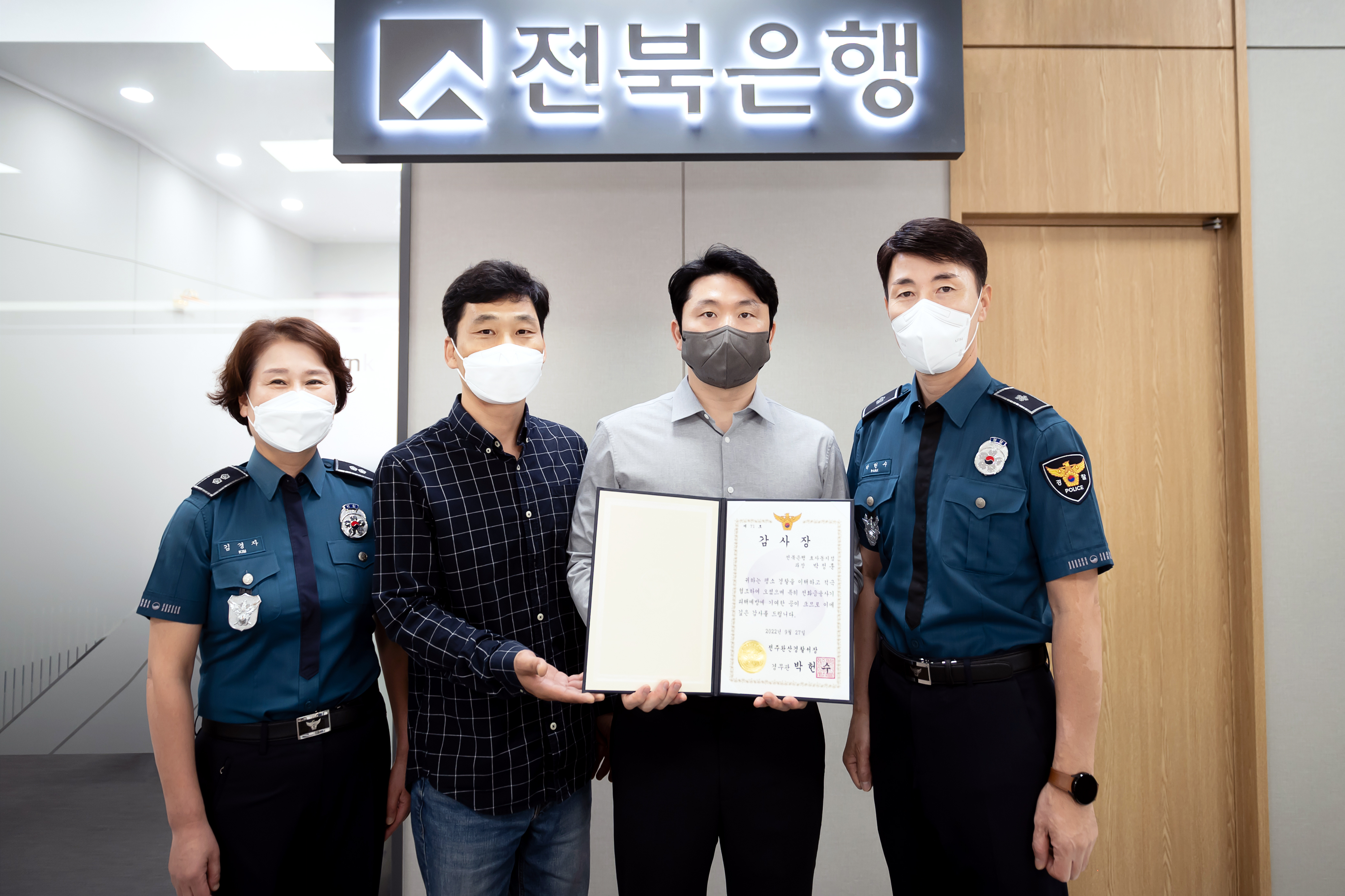 JB금융그룹 전북은행(은행장 서한국) 효자동 지점에 근무 중인 박정훈 과장이 보이스피싱 사기 피해를 예방한 공로로 완산경찰서로부터 27일 감사장을 받았다.