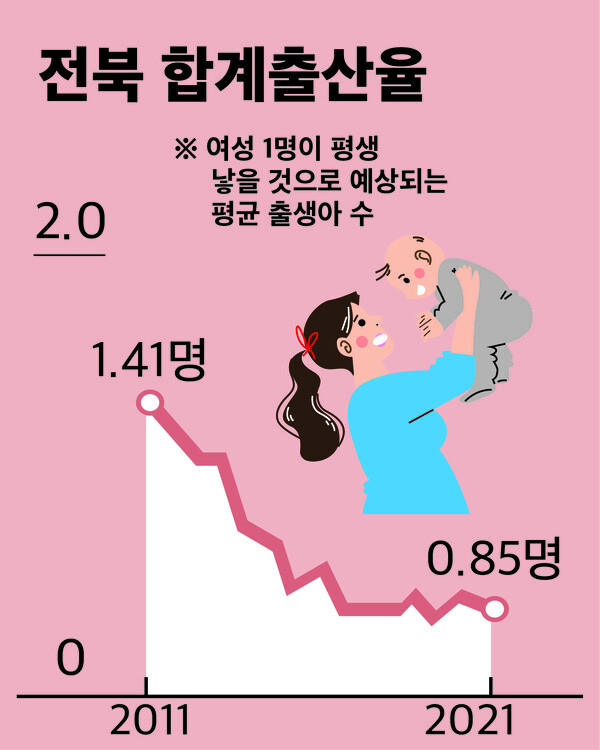 전북 합계출산율은 2015년 1.35명, 2016년 1.25명, 2017년 1.15명, 2018년 1.04명, 2019년 0.97명, 2020년 0.91명을 기록하며 감소세가 이어지고 있다.