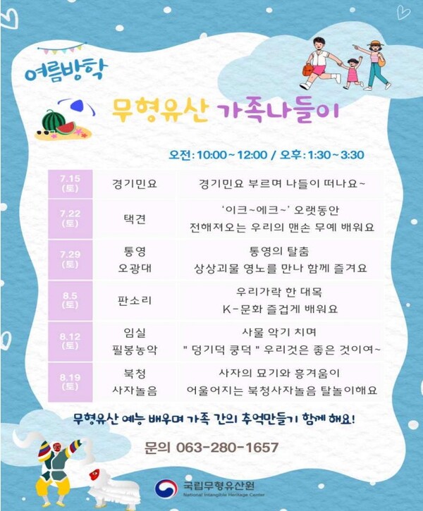 문화재청 국립무형유산원은 여름 방학 및 하계 휴가기간을 맞아 15일부터 8월 19일까지 매주 토요일 전승마루에서 무형유산 주말 체험 프로그램을 진행한다.