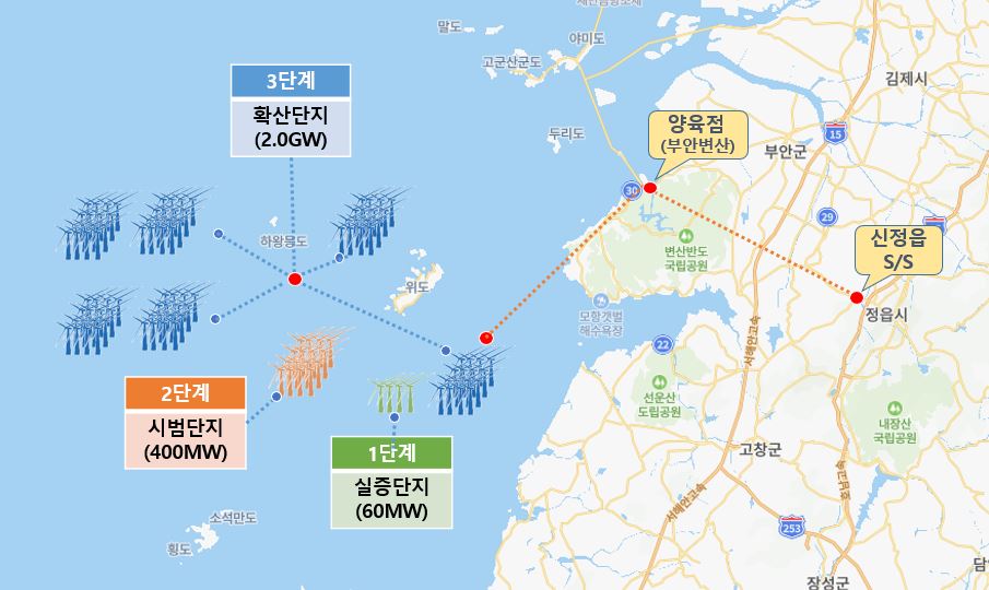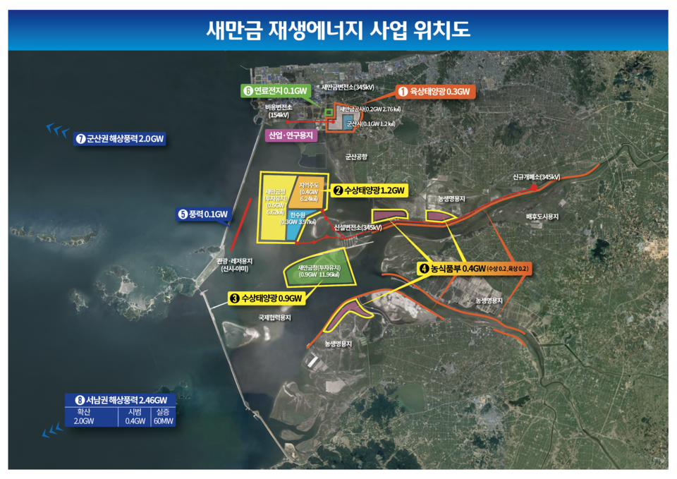 향후 전북자치도의 재생에너지 발전 사업은 새만금 일원에 7GW 규모로 추진되고 있다. 먼저 새만금개발청과 농식품부 등이 오는 2030년까지 6조6천억 원을 들여 태양광 및 풍력 연료전지로 3GW를 생산할 예정이다. 2025년까지 1단계로 약 2.4GW 규모의 육상 및 수상 태양광과 풍력 발전 설비가 완료되며, 2030년까지 수상태양광 발전 설비가 들어서게 된다. 또 해상풍력 발전단지는 고창·부안 해상지역(서남권)과 군산권에 추진된다. 오는 2030년까지 14조7,718억 원을 투자해 서남권에 2.46GW 규모의 해상풍력 발전단지가 조성되고 있다. 60MW 규모의 실증단지가 이미 고창·부안에 완성됐으며, 0.4GW 규모의 시범단지가 부안에, 2.0GW 규모의 확산단지가 고창·부안에 들어서게 된다. 군산권 해상풍력 발전단지는 오는 2029년까지 군산해역 및 서해 EEZ 인근에 1.6GW 규모로 조성되며, 총 9조6천억 원의 사업비가 투자된다.