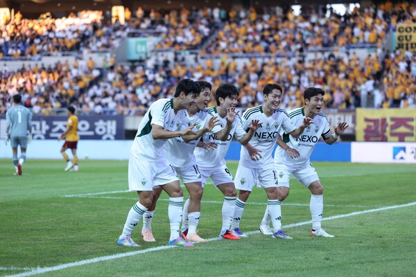 전북현대모터스FC는 26일 광주월드컵경기장에서 열린 하나은행 K리그 1 2025 24라운드 광주FC 원정 경기에서 2-1로 승리했다.승점 3점을 추가한 전북은 승점 54점(16승 6무 2패)을 기록하며 선두 자리를 지켰다. 광주는 승점 획득에 실패하면서 승점 32점으로 리그 6위다.전북은 4-3-3 포메이션으로 나섰다. 송민규-콤파뇨-전진우가 최전방에 자리했고, 김진규-박진섭-강사윤이 중원에 섰다. 김태현-김영빈-홍정호-김태환이 포백을, 골문은 송범근이 지켰다.전북의 출발은 산뜻했다. 전반 14분 오른쪽 측면에서 전진우가 올린 크로스가 송민규의 헤더로 연결됐으나 골대를 때렸다. 이후 혼전 상황에서 공은 김진규 앞으로 떨어졌고, 김진규는 침착한 슈팅으로 골망을 갈랐다.선제골을 내준 광주의 반격도 거셌다. 전반 36분 왼쪽 측면에서 공을 잡은 심상민이 낮고 빠른 패스를 건넸고 이를 최경록이 논스톱 슈팅으로 연결했다. 득점으로 연결됐으나 비디오 판독(VAR) 후 오프사이드로 판면됐다.