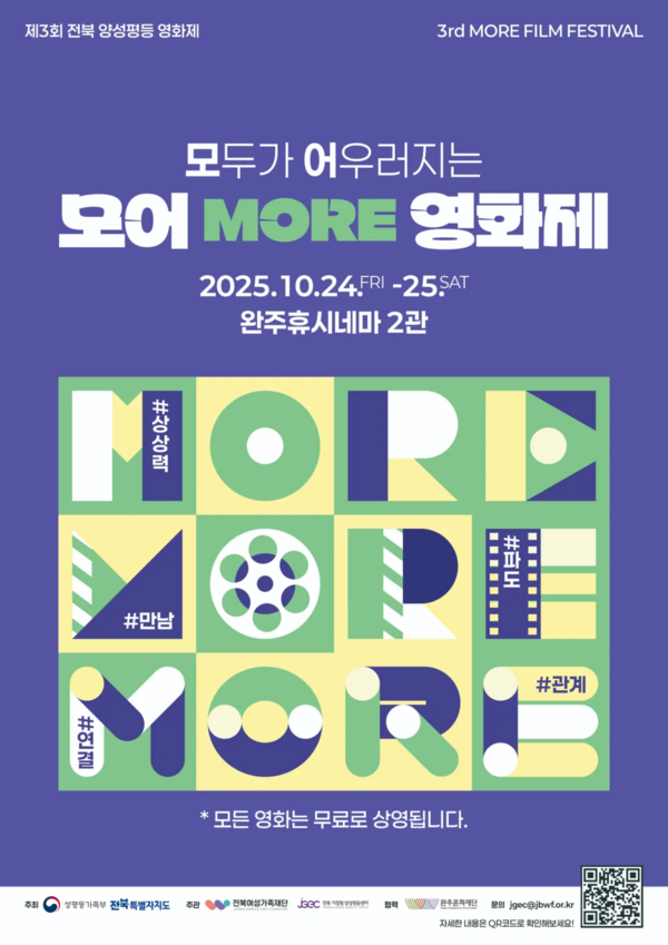 한편, 모어(MORE)영화제는 전북여성가족재단 여성정책연구소 산하 전북거점형양성평등센터가 주최하며, 자세한 사항은 재단 누리집에 안내되어 있다. 신청은 누리집 영화제 안내 공지의 링크 또는 포스터의 QR코드로 가능하다./박세린기자
