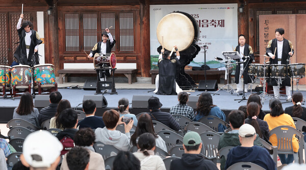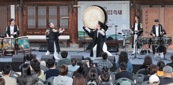 제4회 2025 무형유산이음축제가 8일 전주 한옥마을 완판본문화관 일대에서 열린 가운데 타악연희단 '아퀴'가 통 타악과 동서양 악기의 현대적인 퍼포먼스와 함께 멋진 공연을 펼치고 있다. 이원철기자