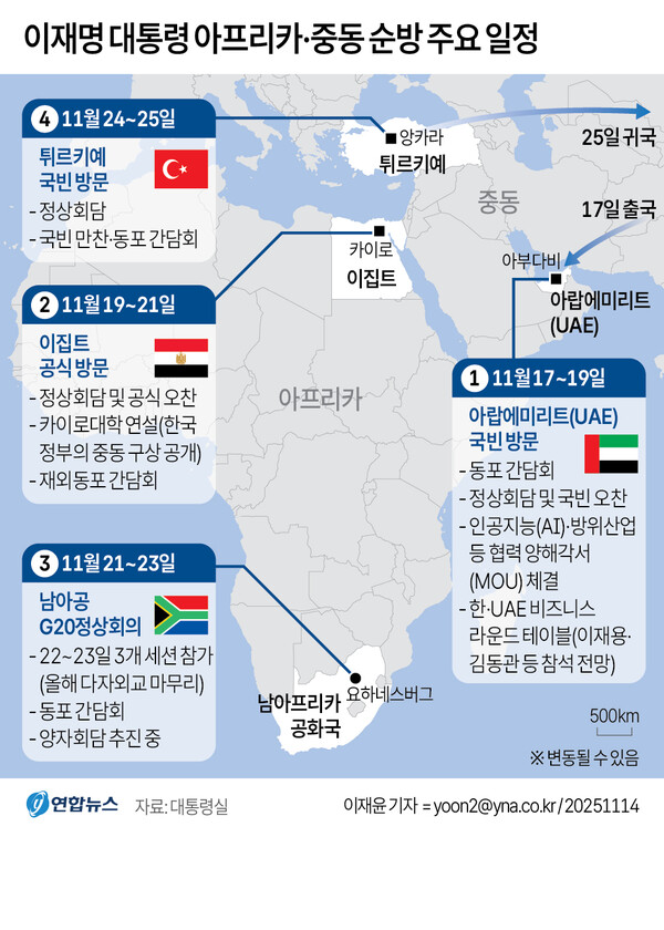 이 대통령은 먼저 17~19일 UAE를 국빈방문하고, 19~21일 이집트를 공식 방문한다. 21일에는 남아공 요하네스버그로 이동해 23일까지 G20 정상회의 일정을 소화한 뒤, 24~25일 튀르키예를 국빈방문한다.