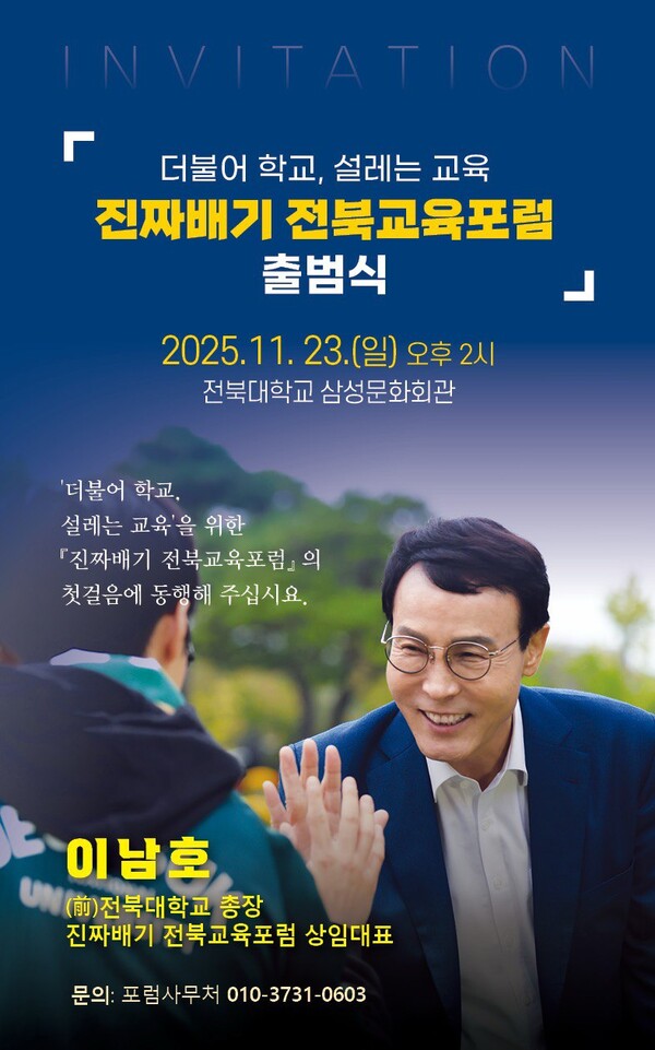 이 전 총장은 오는 23일 진짜배기 전북교육포럼을 출범하고 본격적인 정책 설계 실천과 지역 거버넌스 구축에 나선다.