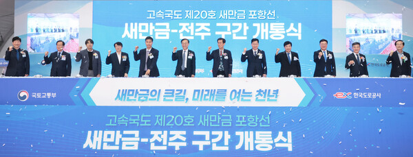 고속국도 제20호 새만금 포항선 새만금-전주 구간 개통식이 지난 21일 김제시 김제휴게소 일원에서 김윤덕 국토교통부 장관을 비롯한 도내 국회의원과 내빈들이 개통 세리머니를 하고 있다. 이원철기자