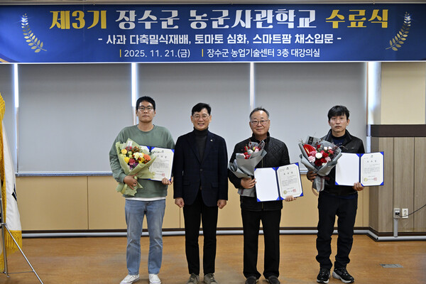 최훈식 군수는 “지난 9개월간 꾸준히 배우고 노력해 수료의 결실을 맺은 교육생들에게 큰 박수를 보낸다”며 “장수군은 앞으로도 전문 농업인력 양성을 위해 실무 중심의 교육을 지속적으로 확대하고, 미래 농업 경쟁력 강화를 위해 적극 지원하겠다”고 말했다.