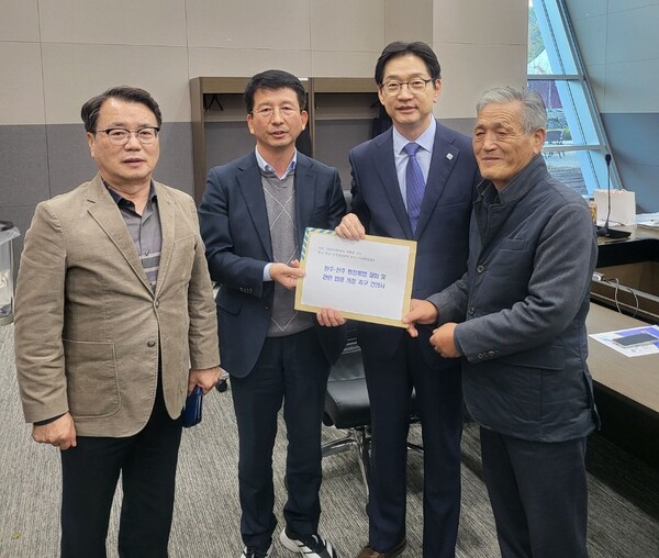 완주-전주통합반대 완주군민대책위원회 송병주 상임대표와 전북도의회 권요안 의원 등이 지난 20일 김경수 지방시대위원장에게 ‘완주-전주 행정통합 철회’ 건의문을 전달했다.
